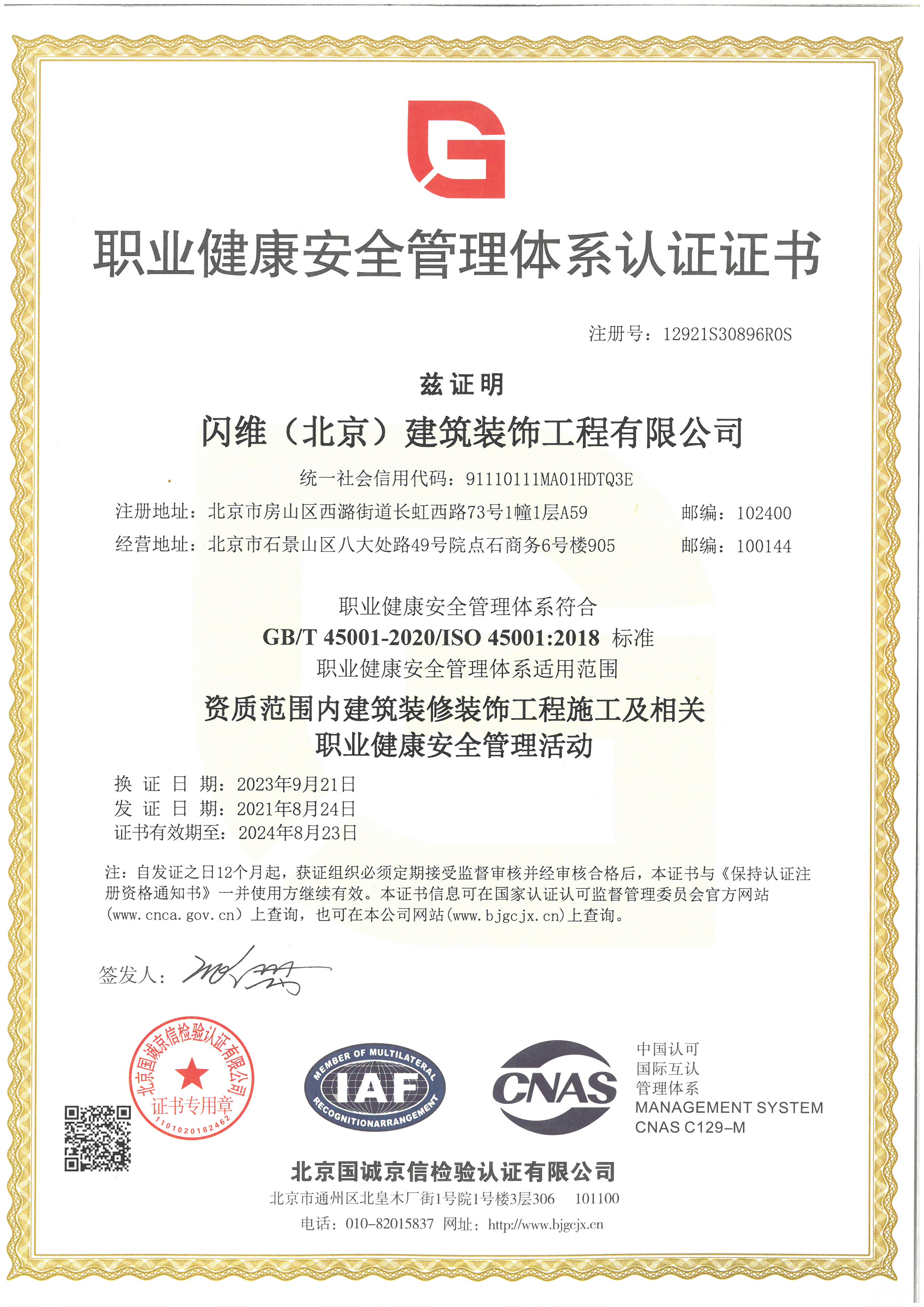 职业健康安全管理体系认证证书
